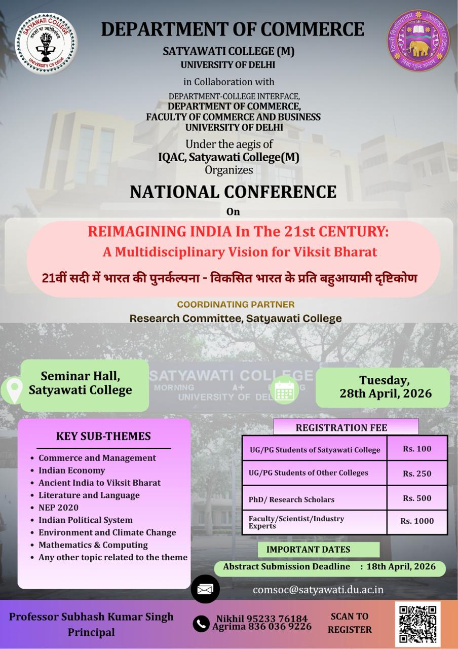 It is an honor and a privilege to lead Satyawati College, an esteemed institution that has consistently upheld the values of academic excellence, inclusivity, and holistic development. Since its inception in 1972, the college has made remarkable strides in infrastructure, student engagement, and educational standards...................